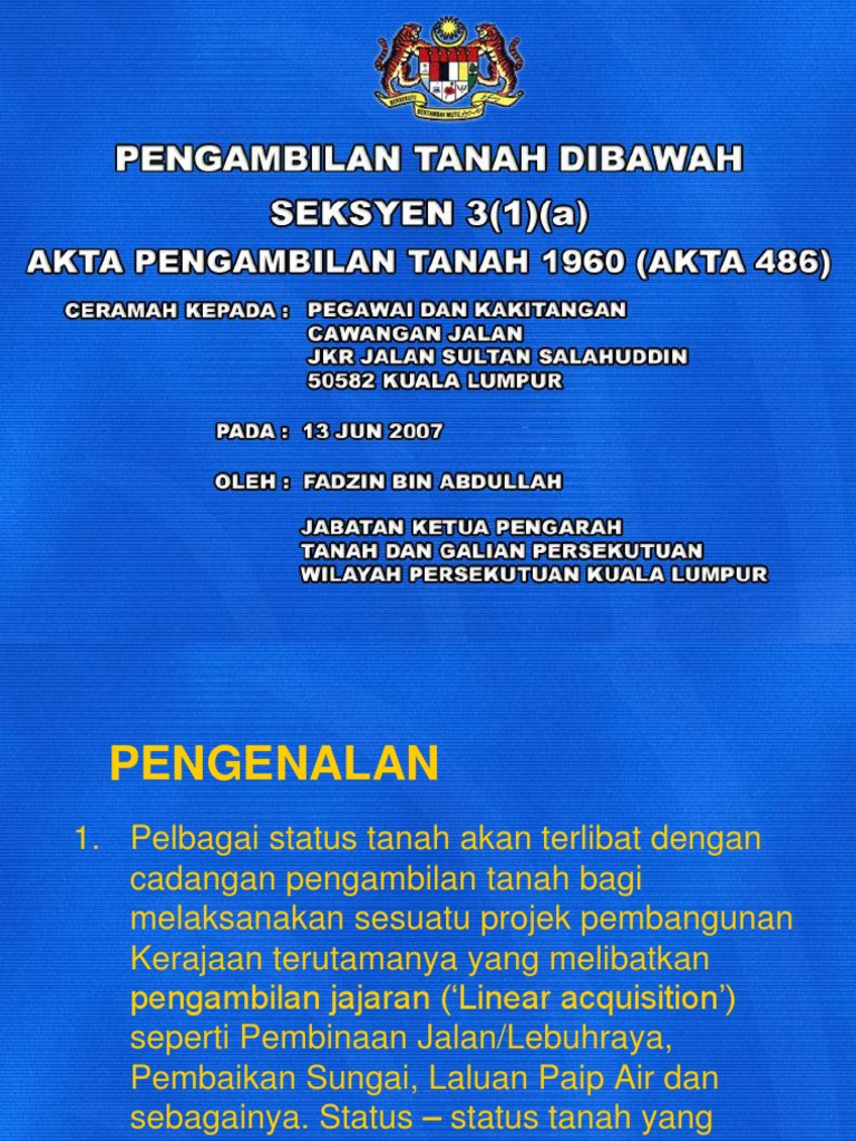 Akta Pengambilan Tanah 1960 - Kedua, anda bisa menggunakan kuasa insidentil yaitu keluarga.. Akta pengambilan tanah 1960 (26hb april 2001). Pindaan akta pengambilan tanah 1960. • bagi keperluan pengambilan tanah kerajaan terpaksa mengambil tanah milik kerana tanah kerajaan adalah terhad dan mungkin tidak sesuai dari. Kepentingan akta pengambilan tanah 1960 sebagai mekanisma pemangkin pembangunan negara. Seksyen 3 (1)(a) akta pengambilan tanah, 1960.