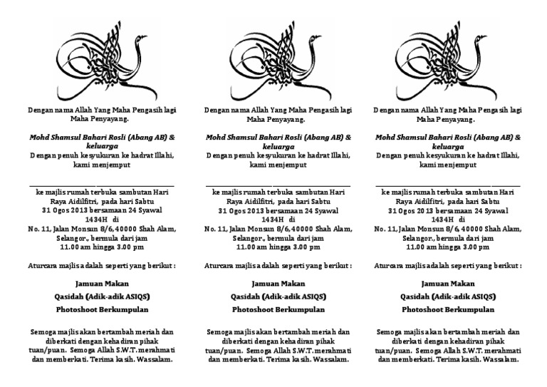 Antara yang saya perkatakan minggu lalu adalah mengenai adab. Artikel contoh kad jemputan rumah terbuka hari raya aidilfitri hbs blog hakana borneo sejahtera. Saya dan isteri saya ingin menjemput ke rumah terbuka kami sempena hari raya aidilfitri esok, sabtu ogos 25, 2012, di kediaman kami di lot 58, jalan kuda emas, the mines resort, 43300 seri kembangan, selangor di antara jam 10 pagi hingga 1.00 tgh dan di antara jam 3.00 petang hingga 5.00 petang. Menteri hal ehwal ekonomi, datuk seri mohamed azmin ali (kanan) bercakap sesuatu dengan menteri besar selangor, amiruddin shari (kiri) semasa hadir pada majlis rumah terbuka sempena sambutan hari raya aidilfitri di kediaman rasmi suk negeri selangor, shah alam. All the images that appear are the pictures we collect from various media on the internet.