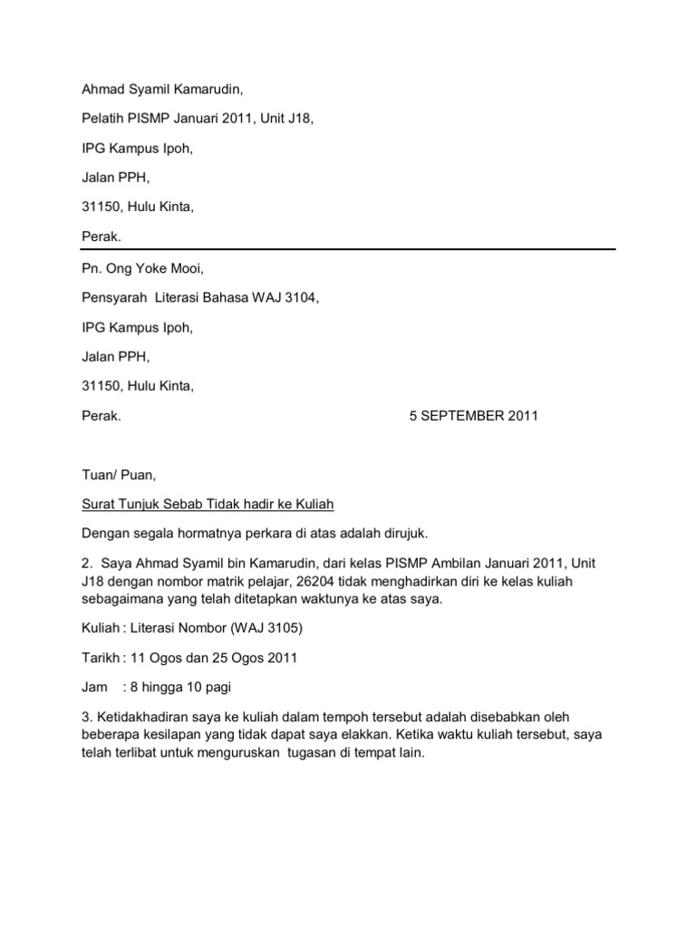 Contoh Surat Tunjuk Sebab Tidak Hadir Kerja Sekolah Lewat from mypt3.com Kumpulan gambar contoh surat tidak hadir ke kuliah terlengkap 2019. Encik mohd nazier bin mat, pensyarah pengusan organisasi pelajar seksyen 6, universiti malaysia sabah. Download 6 contoh surat rasmi tidak hadir ke. Format contoh surat tidak dapat hadir ke kuliah uitm terbaik 2019. Contoh surat tunjuk sebab tidak hadir kuliah.merujuk perkara di atas saya mohamad hanafi bin husin d20111048280 telah tidak hadir ke kuliah english language 2 pada 9 november 2012 jam 3pm 5pm jumaat atas sebab terpaksa pulang ke kampung awal untuk menghadiri majlis pernikahan kakak pertama saya. 118627118 surat ketidakhadiran ke kuliah docx mohamad hanafi bin husin e207 kolej kediaman za u2019ba kampus sultan azlan shah universiti pendidikan course hero 118627118 surat ketidakhadiran ke kuliah docx mohamad hanafi bin husin e207 kolej kediaman za u2019ba kampus sultan azlan shah universiti pendidikan course hero Facebook twitter « newer post older post » search here.